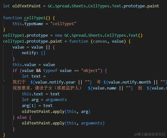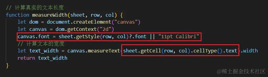 计算文本长度时,使用canvas的measureText方法即可,需要将canvas的字体设置为和表单中一致,文本存在自定义单元格的实例中,直接获取即可: