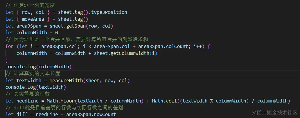 而第二点,则稍微有点麻烦,因为真实的文本需要几行单元格展示,不仅和文字的长度有关,还与单元格的宽度(考虑到单元格是合并的,这里需要分开计算并相加)、字体的大小都有关系: