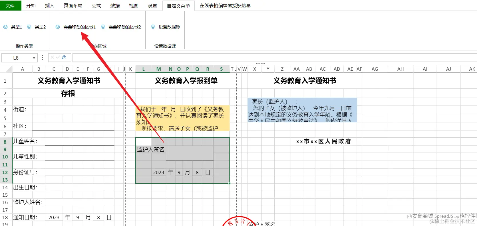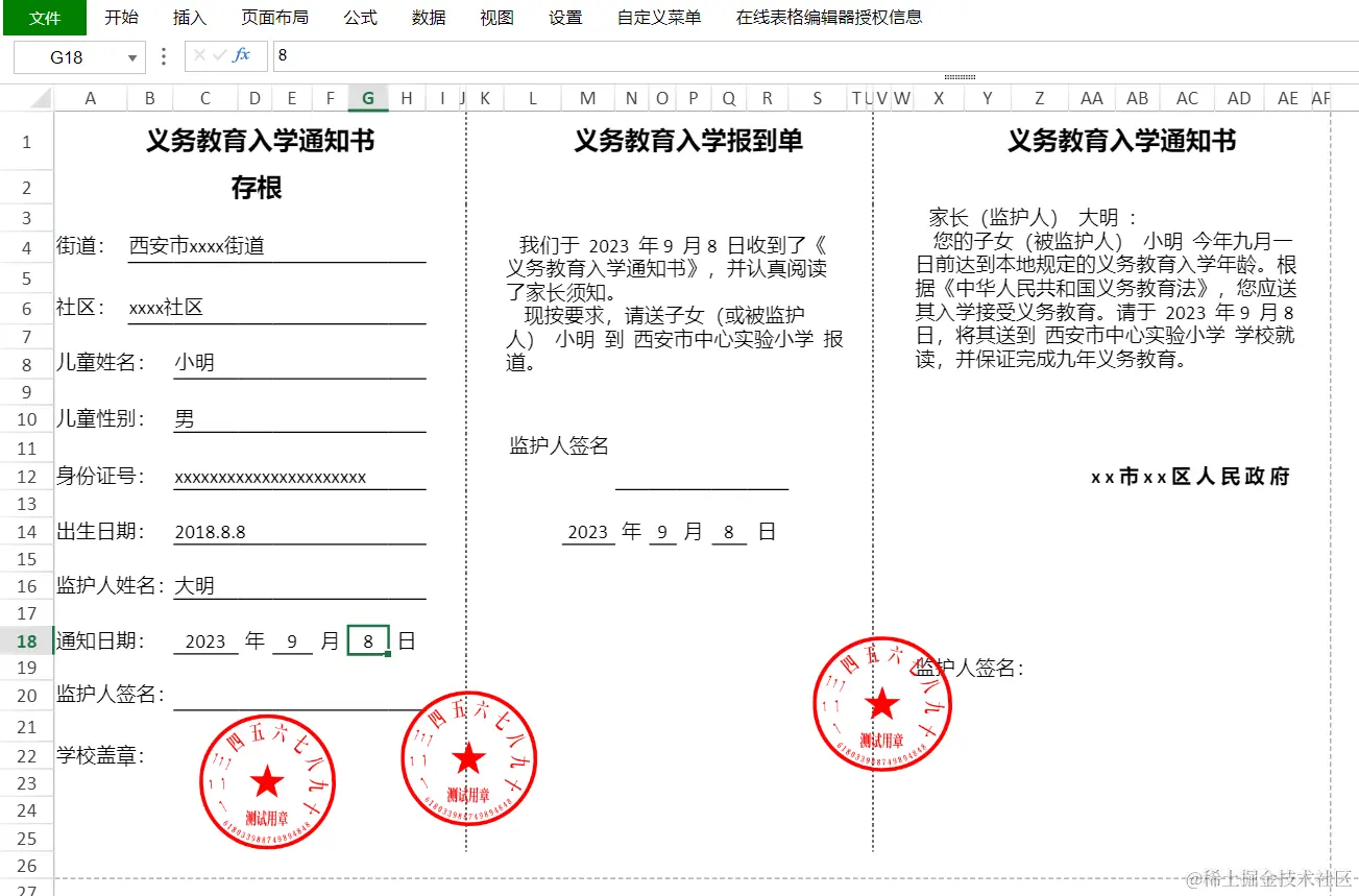 1. 部分单元格需要同时绑定多个字段,并将其组合为一段文字,比如上图中的义务教育入学报道单和义务教育入学通知书下方的两段话,它们包含了日期信息和学校名称信息。