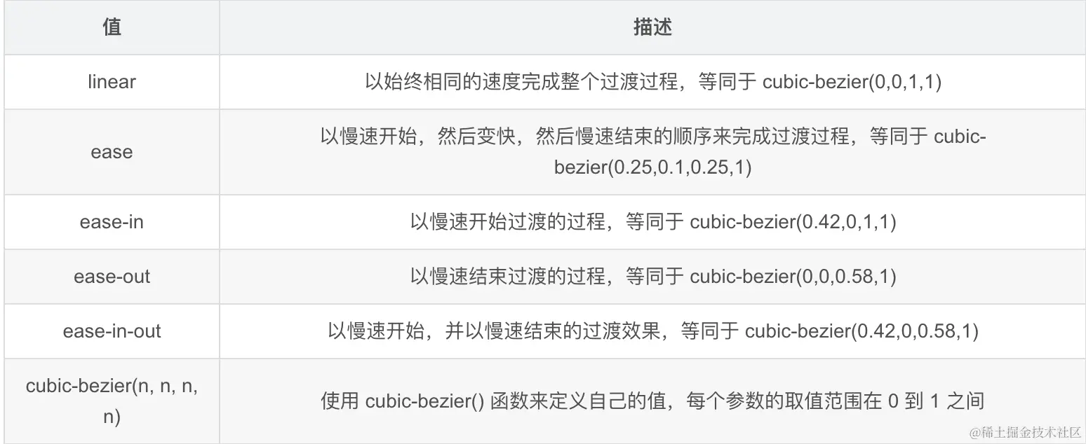transition-timing-function:设置过渡动画的动画类型,具体值可以看下图