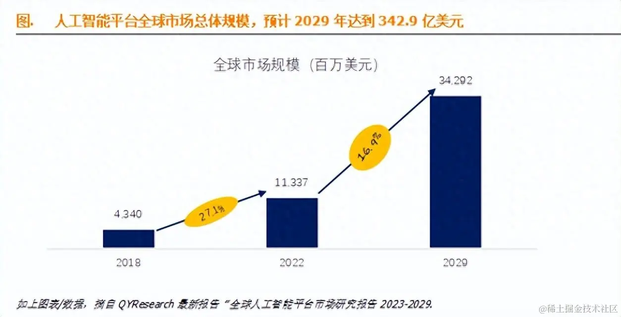 据QYResearch调研团队最新报告“全球人工智能平台市场报告2023-2029”显示,预计2029年全球人工智能平台市场规模将达到342.9亿美元,未来几年年复合增长率CAGR为16.9%。据QYResearch调研团