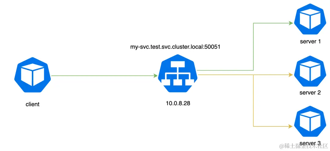那么,对于先前的设置,问题在于默认的Kubernetes服务只创建了一个DNS记录,链接到单个IP。因此,当您执行类似 nslookup my-service.{namespace}.svc.cluster.local 的操作时,返回的是一个单个IP,这使得在常见的gRPC实现中连接图看起来像这样: