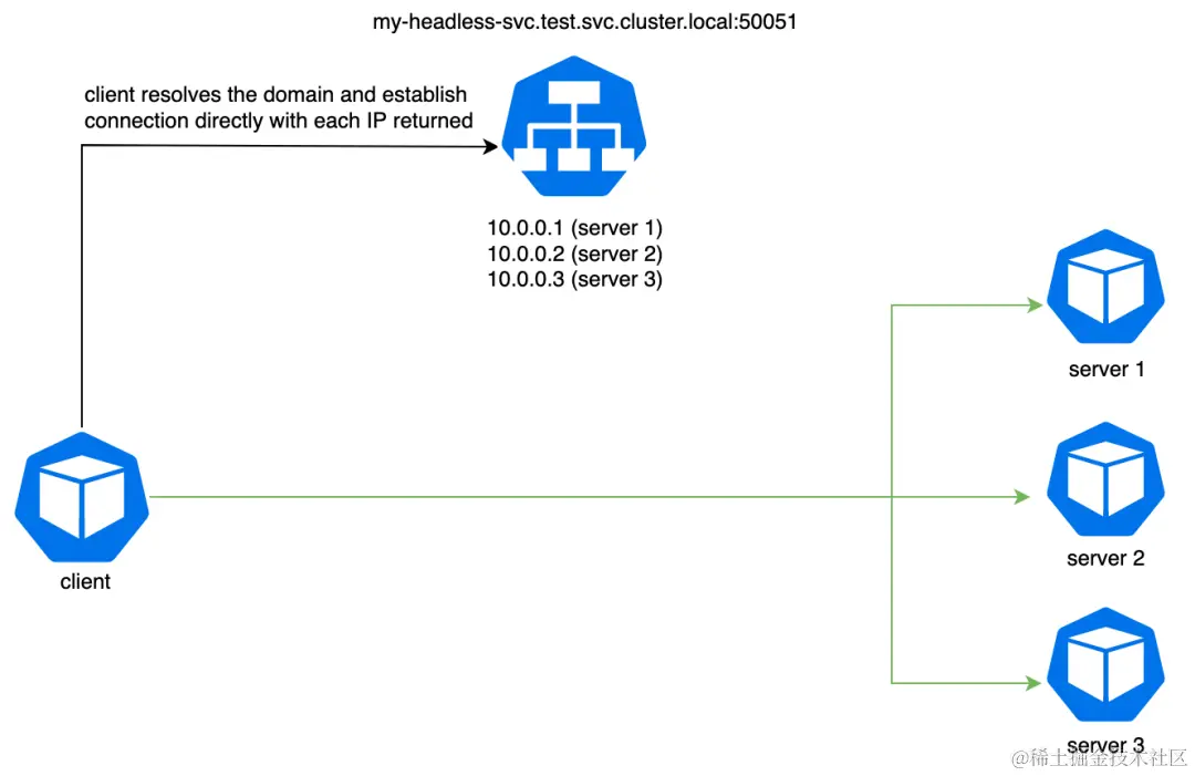 例如,在具有无头Kubernetes服务的连接图中,可以看到连接发生了一些变化,现在我们不通过Kubernetes服务来访问Pod,而是使用Kubernetes服务来检索与域名关联的Pod列表,然后直接与Pod建立连接。但是不要因为直接连接到Pod而感到惊慌,因为我们在客户端中设置了DNS解析器类型,该解析器将持续监视与无头服务的更改,并将与可用的Pod保持最新的连接。