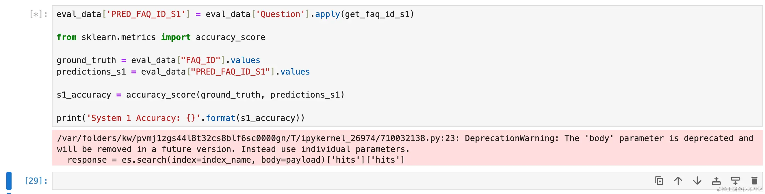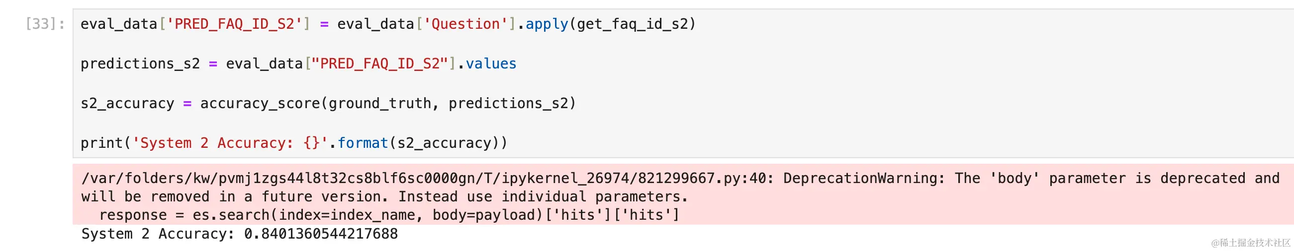 好的! 我们一切准备就绪,开始我们的评估。 我们将为两个系统生成一个预测列,并将其与原始 faq_id 进行比较。