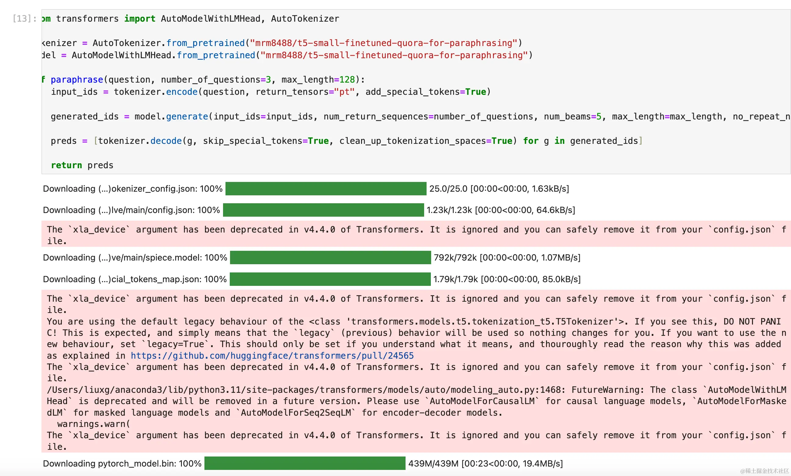 4. model = AutoModelWithLMHead.from_pretrained("mrm8488/t5-small-finetuned-quora-for-paraphrasing")
