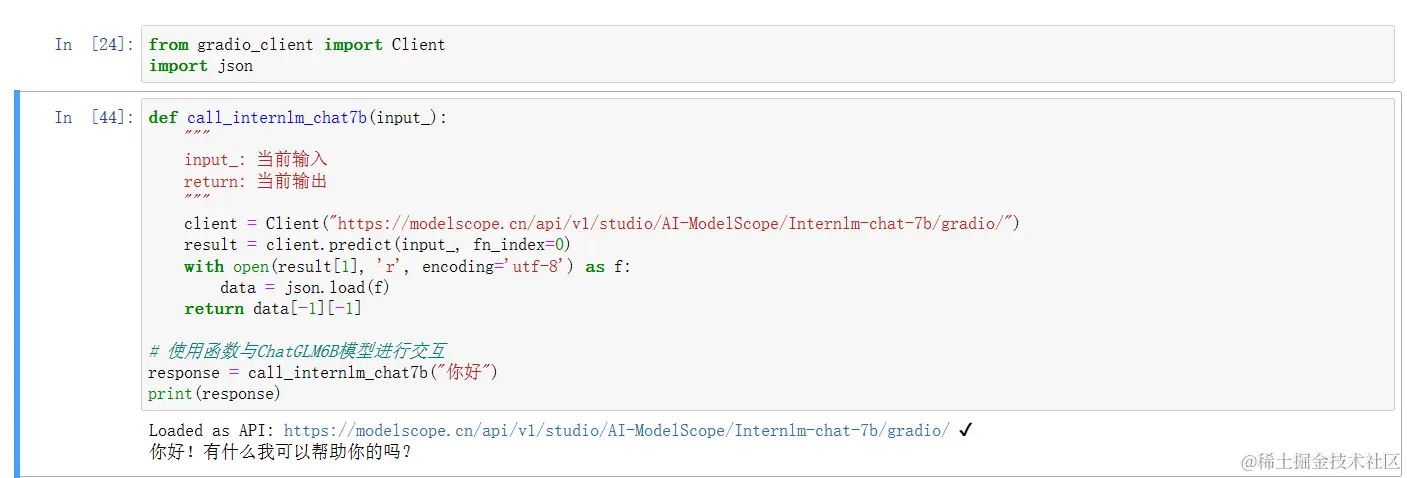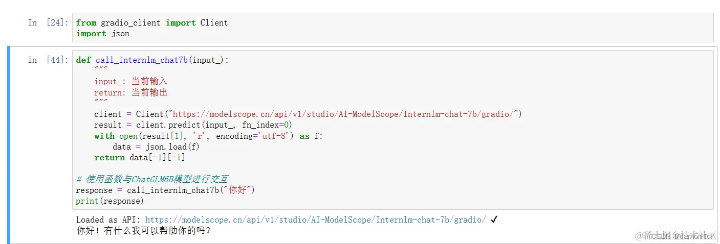 定义一个名字为call_internlm_chat7b函数,用来完成模型的调用,模型输入为input_,输出为模型对于输入的输出
