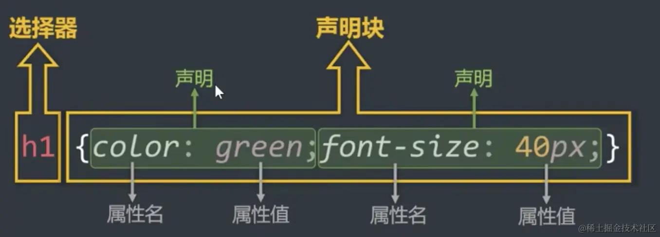 - 声明块:设置具体的样式(声明块是有一个或多个声明组成的),声明的格式为: