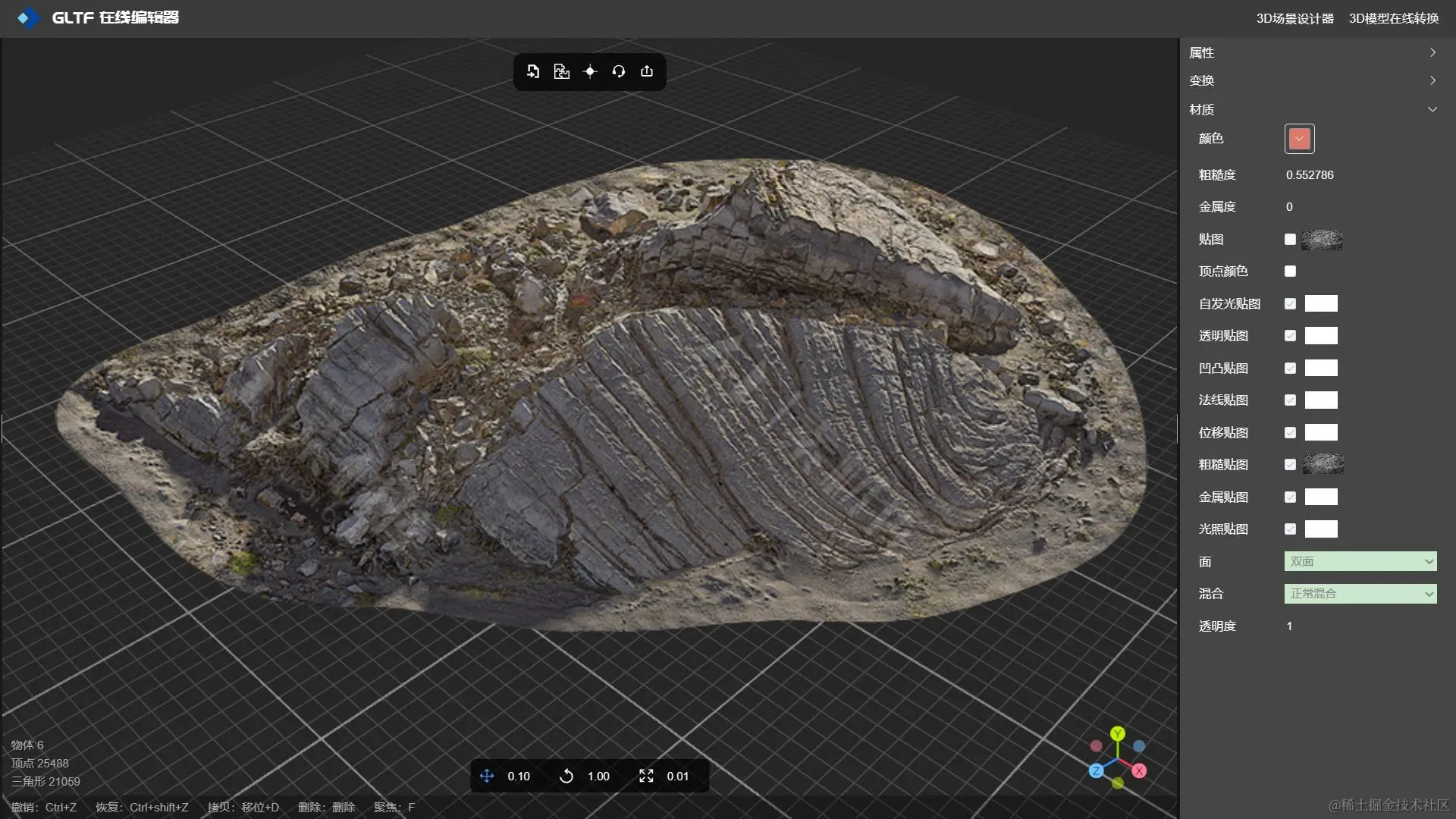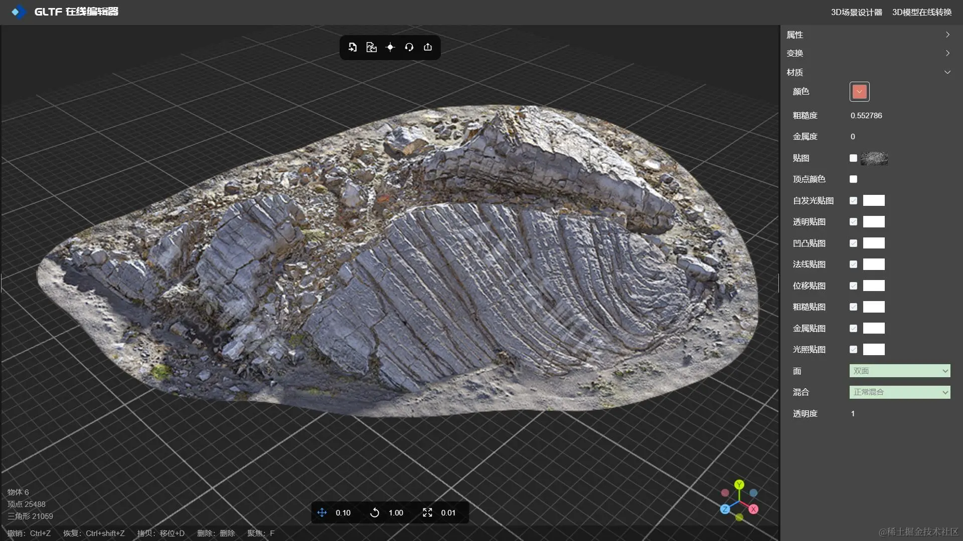 GLTF 编辑器 是一个功能强大、易于使用的在线3D模型编辑和查看工具,它支持多种格式的3D模型导入并将模型导出为GLB格式,除了可以对3D模型进行基本属性的修改之外,还支持对模型原点重置以及模型材质纹理修改。对于3D开发者和设计师来说,GLTF 编辑器 是一个非常有用的工具,可以帮助他们更方便地处理3D模型。