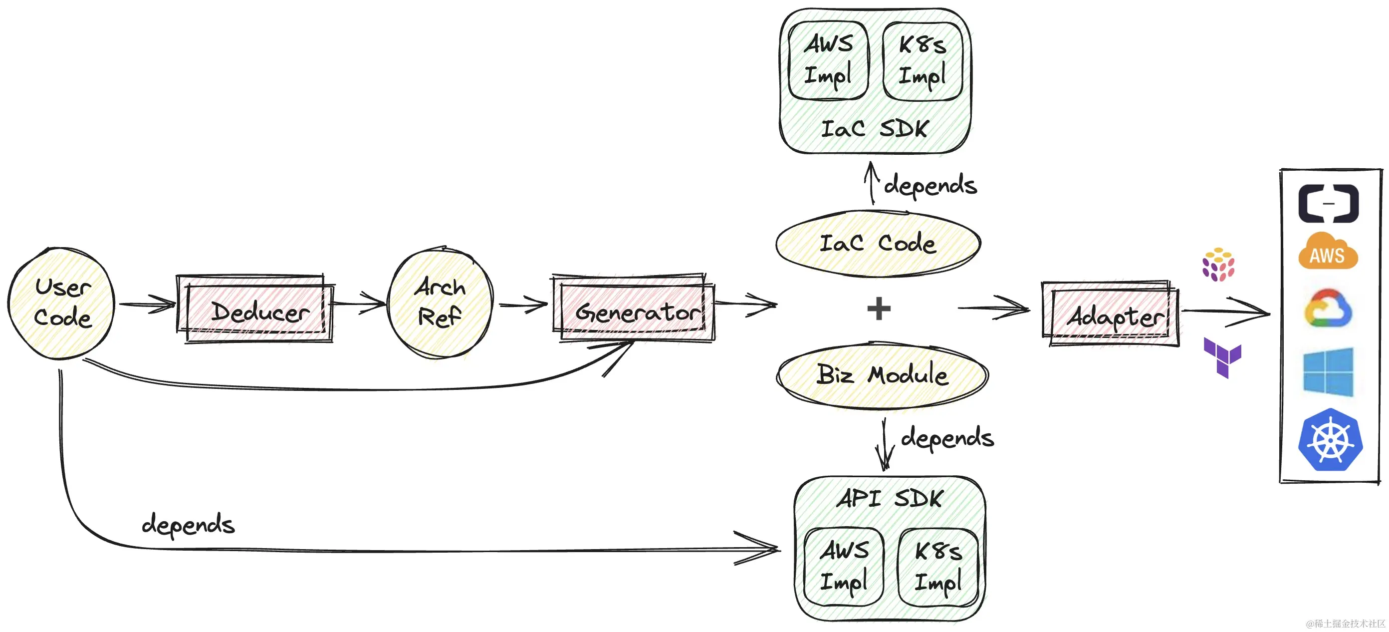而这个思路的关键点就在于:编译时执行的代码是根据推导出的参考架构生成而来,不需要在编译时执行用户代码。这也是与其他 Infrastructure from Code 技术的关键区别。