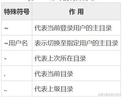 除此之外,cd 命令后面可以跟一些特殊符号,表达固定的含义,如表 1 所示: