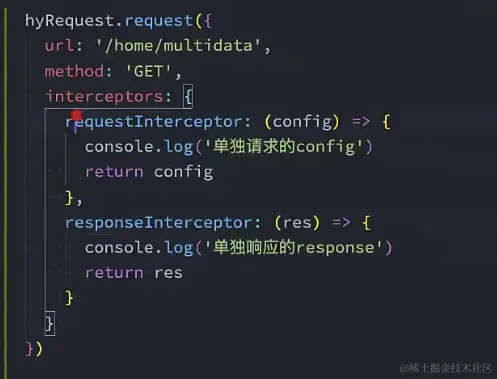 而对于定义好的实例,在进行某个请求时的单独拦截器使用,则如下图所示。在request中定义interceptors,这样定义的拦截器就是为这个具体的请求来使用的。