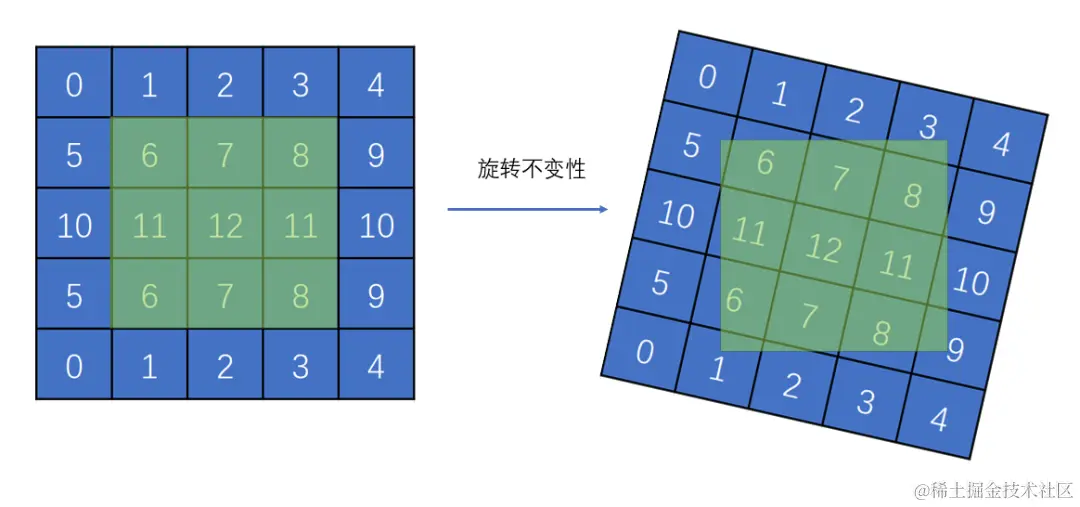 如果输入图片有轻微的旋转,经过最大池化,只要图片旋转的角度不是很厉害,依旧可以在对应位置获取到目标区域中的最大值12。