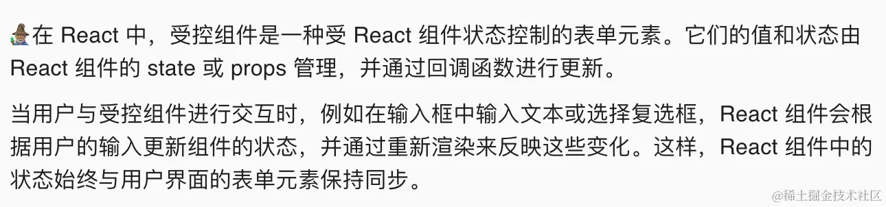 我一直不喜欢文章里面只有干巴巴的代码,这样让人看了一头雾水,结合主题来展开一些有关的知识点倒是很有必要的。所以先来复习一下 React 中“受控组件”的概念,下面有请 chat-gpt 发言