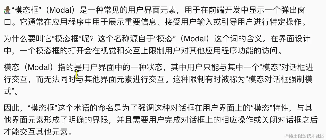 首先“模态框”这个词的含义是什么呢?我第一次看也一脸懵逼,我对这一类可以弹出的元素一直称之为“对话框”,于是我问了下 chat-gpt