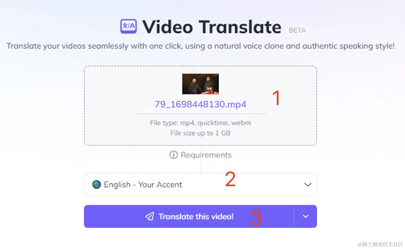按照下图把操作顺序:上传一个视频,注意视频时长需要在30秒至5分钟之内;然后选择转换后的语言,目前有14种;然后点击“Translate this video”。