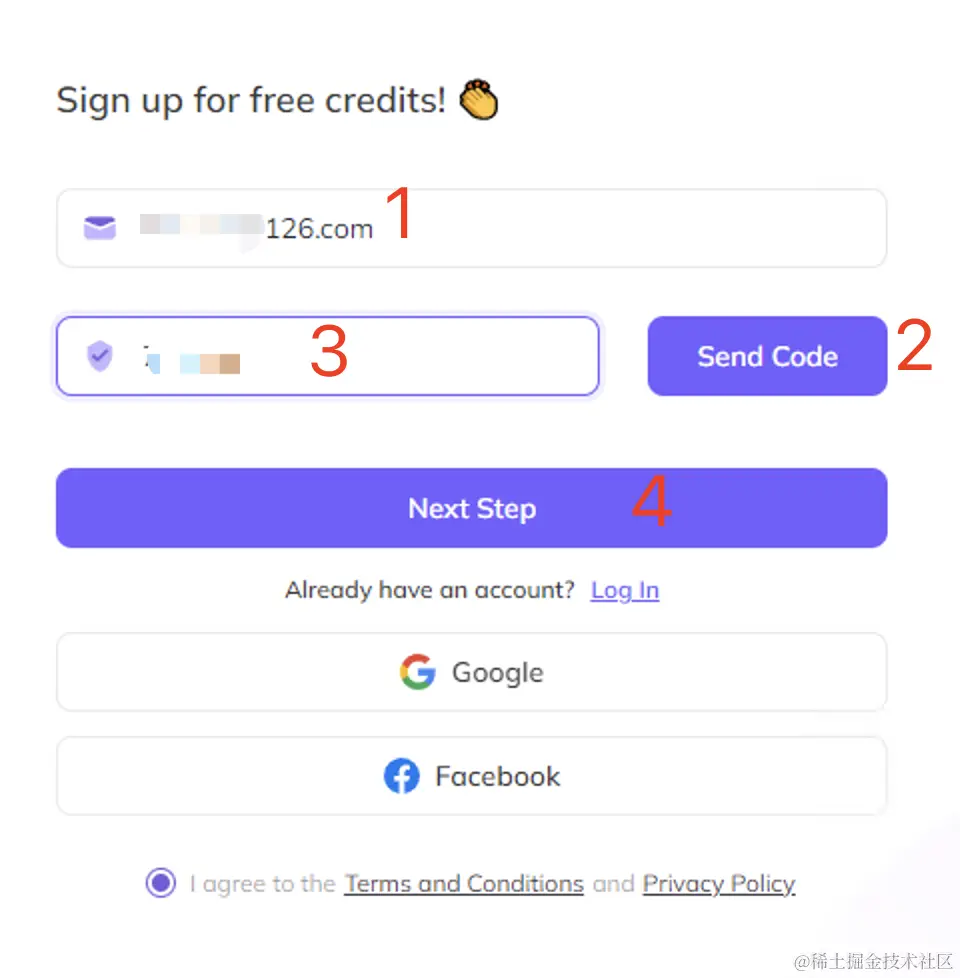 按照下图中的顺序进行注册。首先输入你的电子邮箱,然后点击“Send Code”,然后去你的邮箱中查收验证码,在输入框中输入收到的验证码,最后点击“Next Step”进入下一步。