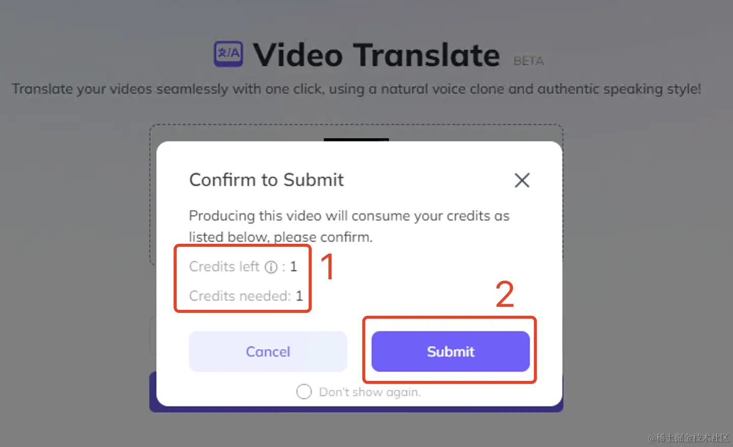 系统还会弹出一个是否确认提交的对话框,大概意思是这会消耗一个“Credits”,因为HeyGen赠送了一个Credits,点击“Submit”就行了。