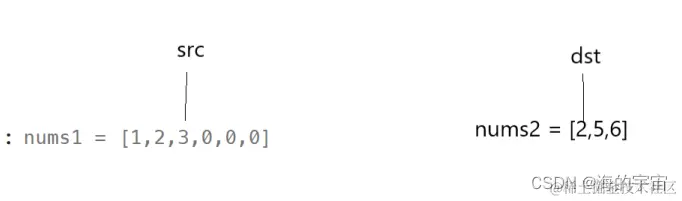 输入:nums1 = [1,2,3,0,0,0], m = 3, nums2 = [2,5,6], n = 3 输出:[1,2,2,3,5,6] 解释:需要合并 [1,2,3] 和 [2,5,6] 。 合并结果是 [1,2,2,3,5,6] ,其中斜体加粗标注的为 nums1 中的元素。