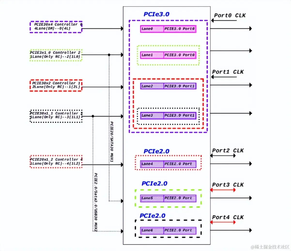 - pcie30phy拆分为4个1Lane,pcie3phy的port0lane1只能固定配合pcie2x1l0控制器,pcie3phy的 port1lane1只能固定配合pcie2x1l1控制器;