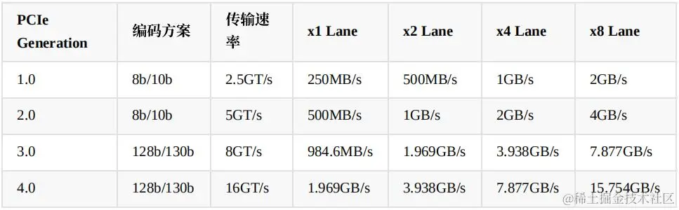 PCIe gen1 和 PCIe gen2 采用的编解码方式是 8b/10b,PCIe gen3 和 之后的 采用的是 128b/130b 的编码方式。