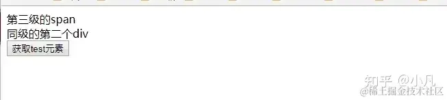 两个class都包含“test”的元素,一个在文档树的前面,但是它在第三级,另一个在文档树的后面,但它在第一级,通过querySelector获取元素时,它通过深度优先搜索,拿到文档树前面的第三级的元素。运行结果: