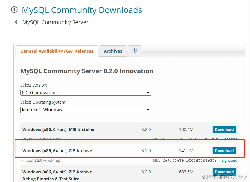 选择免安装版本,安装包下载dev.mysql.com/downloads/m…
