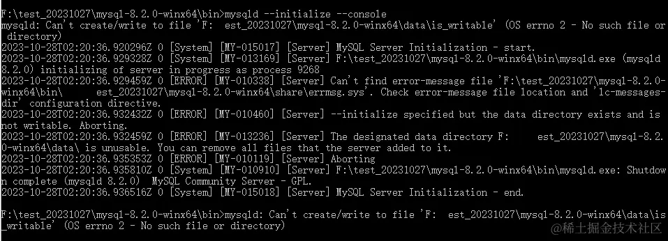 遇到第一个坑,mysqld: Can't create/write to file 'F: est_20231027\mysql-8.2.0-winx64\data\is_writable' (OS errno 2 - No such file or directory)
