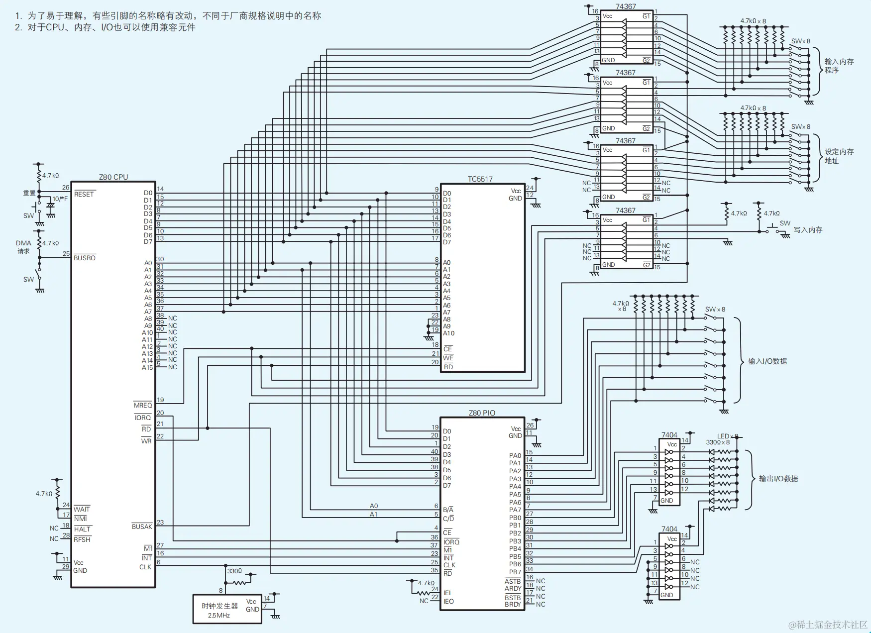 接下来,作者用一个简易的电路图来描述并模拟计算机的运行。里面包括CPU、内存、IO、时钟发生器、外接设备,借助这个简易系统讲解了DMA(不经CPU直接外部访问内存)、中断(硬件通知接口,避免一直监听IO)这些基础知识。能更直观跟底层地理解到知识。CPU、内存、IO中不仅有地址总线引脚、数据总线引脚,还有控制引脚。