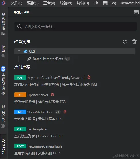 API插件是CodeArts IDE原生内置的插件,默认已经安装。左侧的导航栏中可以看到相关图标。