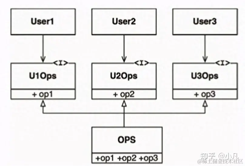 同样,我们也假设这个例子是用Java这种静态类型语言来实现的,那么现在User1的源代码会依赖于U1Ops和op1,但不会依赖于OPS。这样一来,我们之后对OPS做的修改只要不影响到User1的功能,就不需要重新编译和部署User1了。