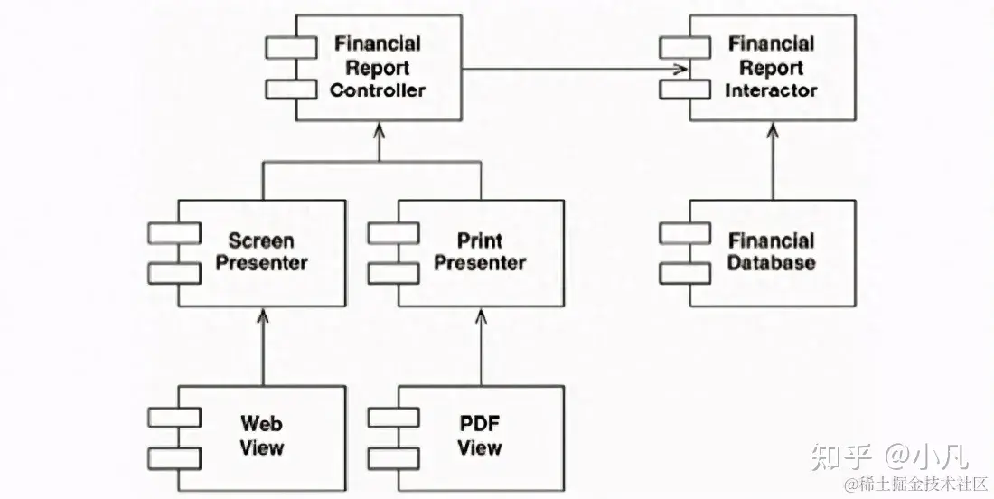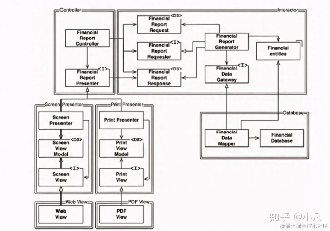 例如,FinancialReportGenerator和FinancialDataMapper之间的FinancialDataGateway接口是为了反转 interactor与Database之间的依赖关系而产生的。同样的,FinancialReportPresente接口与两个View接口之间也类似于这种情况。