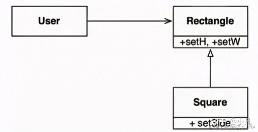 在这个案例中, Square类并不是 Rectangle类的子类型,因为 Rectangle类的高和宽可以分别修改,而 Square类的高和宽则必须一同修改。由于User类始终认为自己在操作 Rectangle类,因此会带来一些混淆。例如在下面的代码中:
