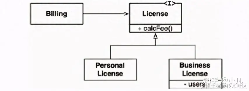 假设我们有一个 License类,其结构如下图所示。该类中有一个名为 callee()的方法,该方法将由Billing应用程序来调用。而 License类有两个“子类型” :PersonalLicense与 Businesslicense,这两个类会用不同的算法来计算授权费用。
