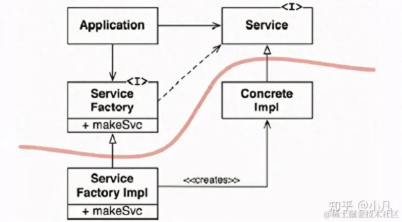 下面,我们通过下图来描述一下该设计模式的结构。如你所见, Application类是通过 Service接口来使用 Concretelmp类的。然而, Application类还是必须要构造 Concretelmpl类实例。于是,为了避免在源代码层次上引入对 Concretelmpl类具体实现的依赖,我们现在让 Application类去调用ServiceFactory接口的 makeSvc方法。这个方法就由 ServiceFactorylmpl类来具体提供,它是ServiceFactoryl的一个衍生类。该方法的具体实现就是初始化一个 Concretelmpl类的实例,并且将其以 Service类型返回。