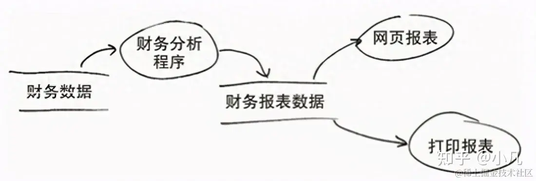 利用SRP,我们可以按下图中所展示的方式来处理数据流。即先用一段分析程序处理原始的财务数据,以形成报表的数据结构,最后再用两个不同的报表生成器来产生报表。