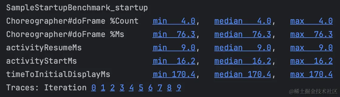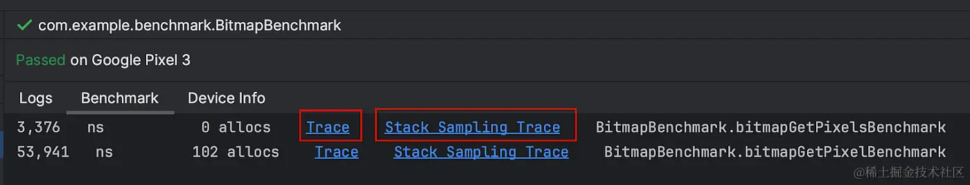 启用这些功能后, 你会在基准结果中看到一个新的"Trace"和"Stack Sampling Trace"链接, 可以使用 Android Studio Profilers 检查这些结果.