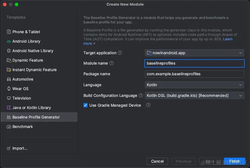 创建新模块并选择"Baseline Profile Generator", 进入对话框并点击完成.