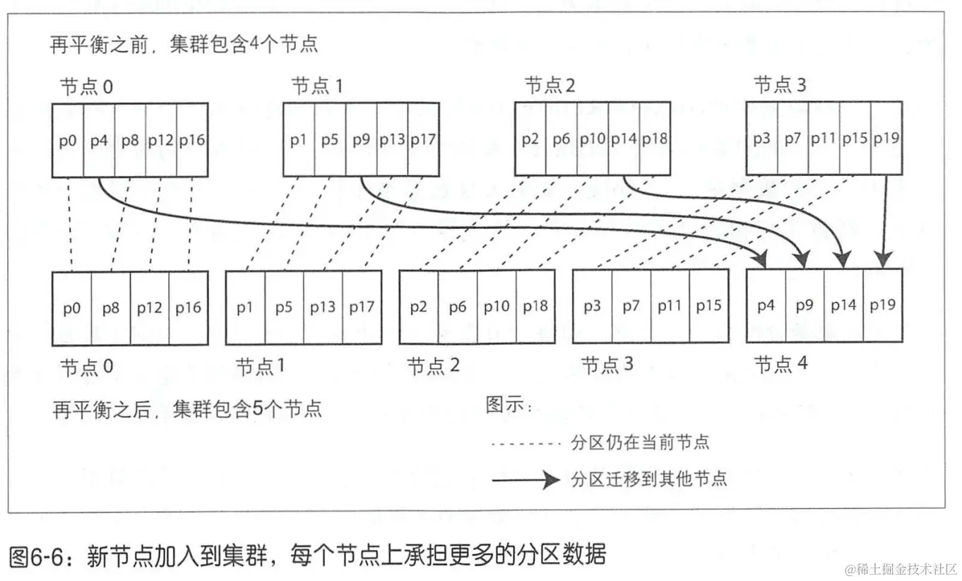新节点加入时,只需要改变分区和节点的对应关系,并且只需要迁移部分分区数据,这个过程可以逐步完成,在此期间,旧的分区数据并不受影响。
