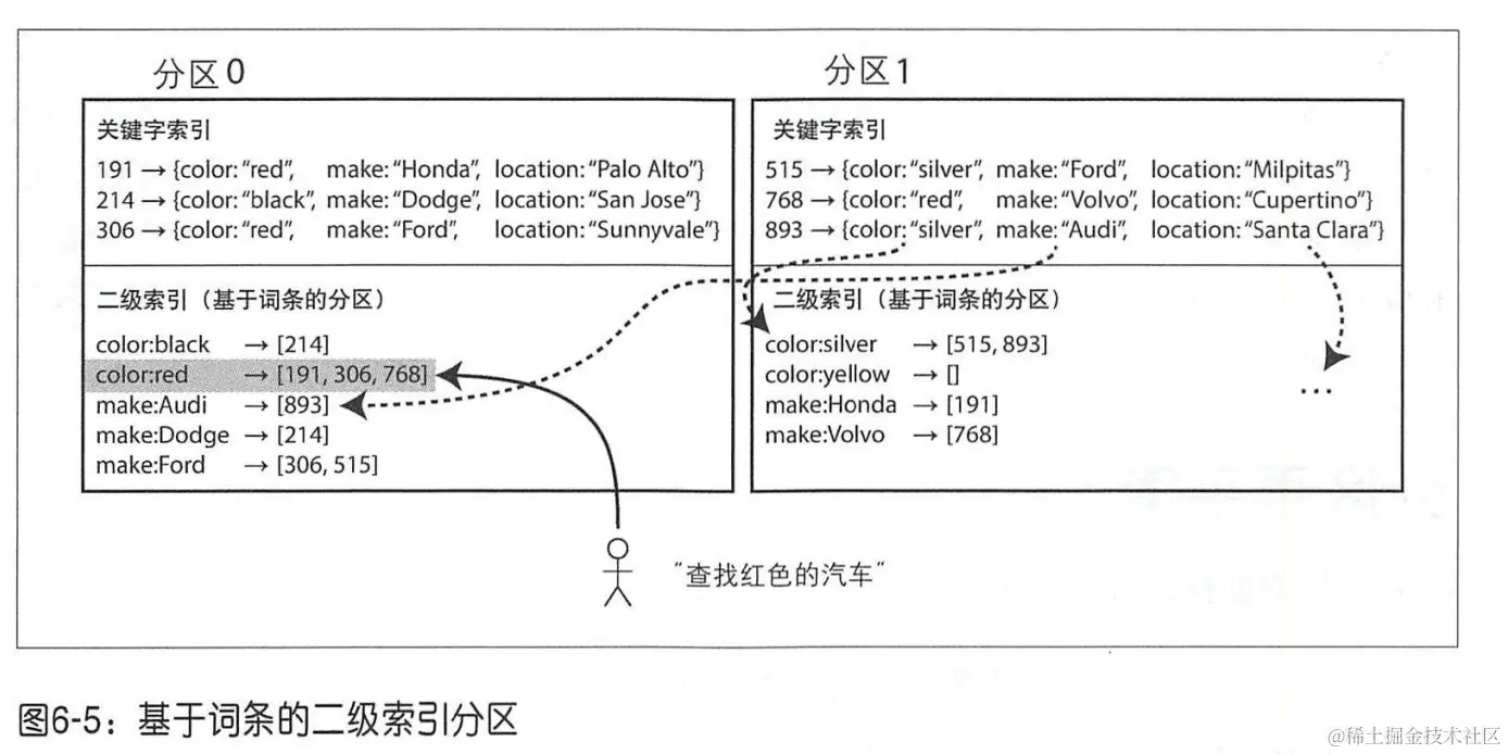书中举例二手车网站,使用文档id进行分区,现在用户按颜色和厂商搜索汽车,在颜色和厂商字段上建立二级索引。比如,每当一辆红色汽车添加到数据库时,数据库分区会将其添加到二级索引条目为“color:red”的文档id列表中。(es倒排索引呗)