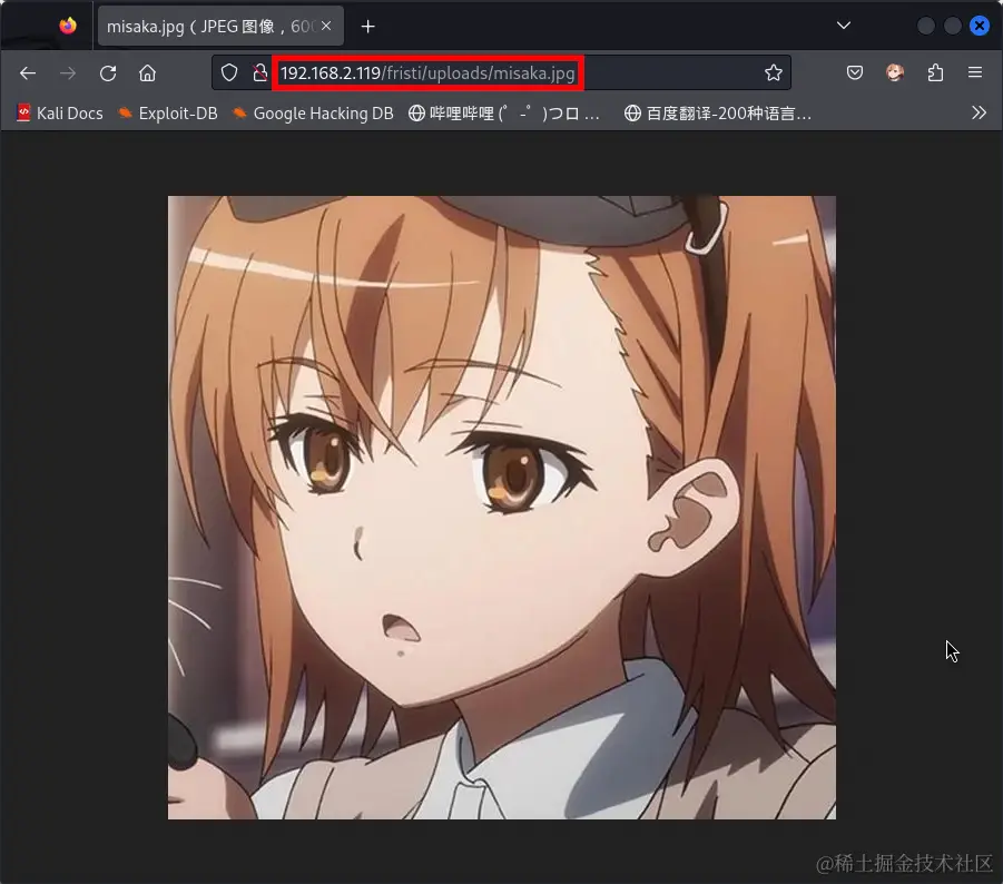 直接打开该网址,页面上只返回了no!这个英文单词,但是在网址最后输入了上传时的文件名称后,我们成功访问到了上传的文件。网址为:http://192.168.2.119/fristi/uploads/misaka.jpg