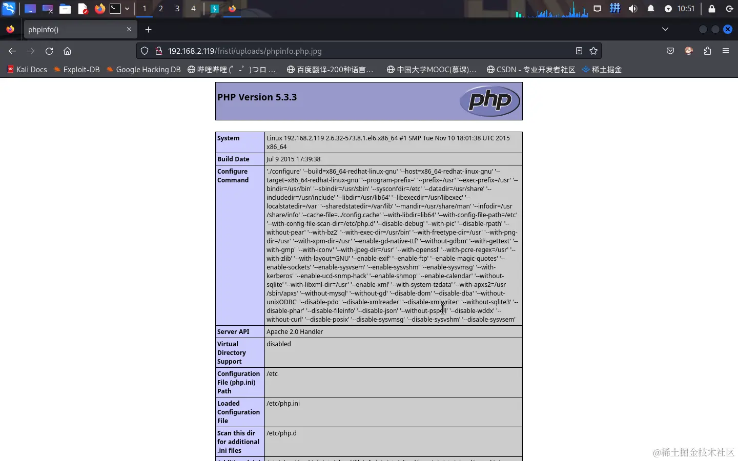 发现上传成功了,尝试访问:http://192.168.2.119/fristi/uploads/phpinfo.php.jpg