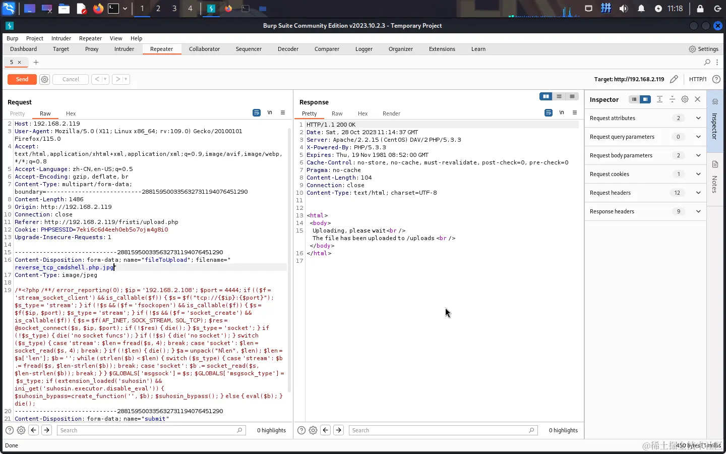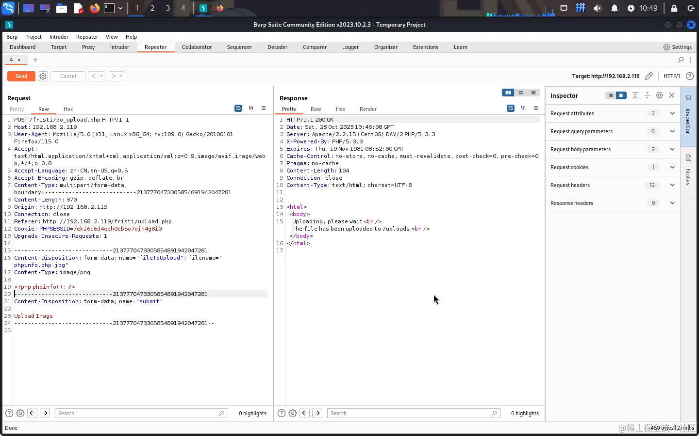 由此得知上传的文件可以被访问,接下来打开BurpSuite,尝试上传PHP脚本文件: