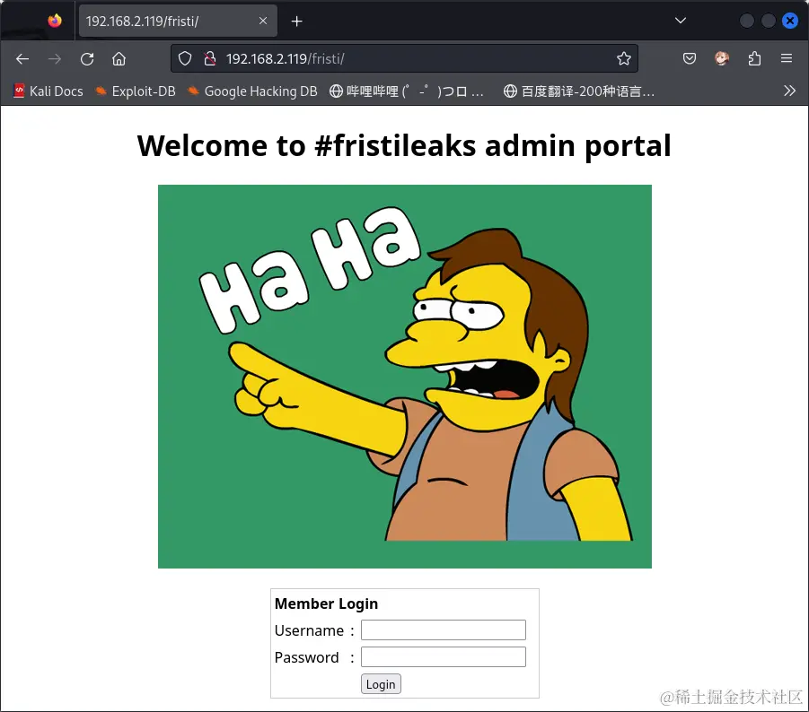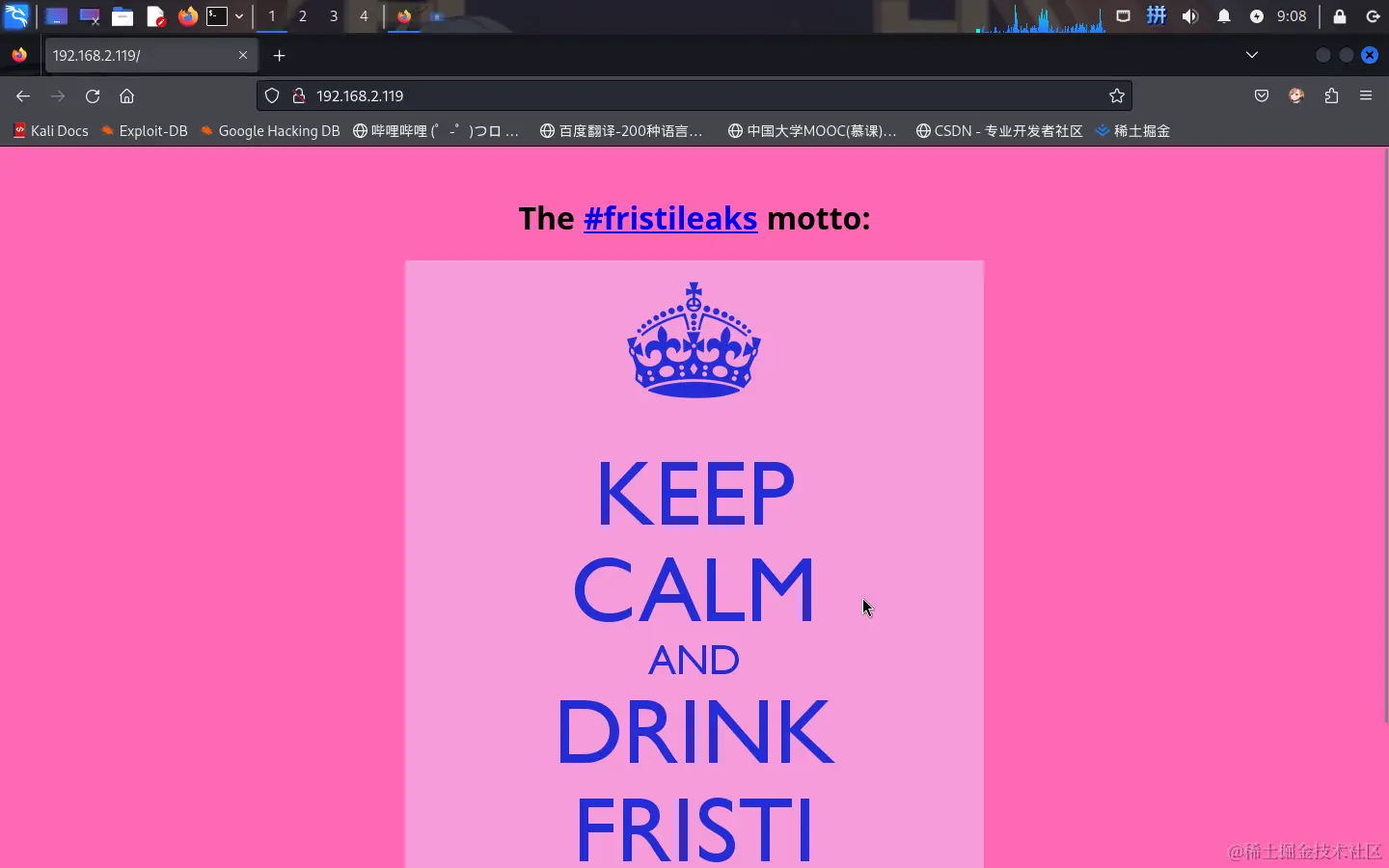 渗透似乎陷入了僵局。返回主页,主页上的文字引起了我的注意:Keep calm and drink fristi,这里的单词fristi似乎不是常规的名词或形容词,而是一个名称。结合这句话前面的意思,我打开了这个网址:http://192.168.2.119/fristi,果然:
