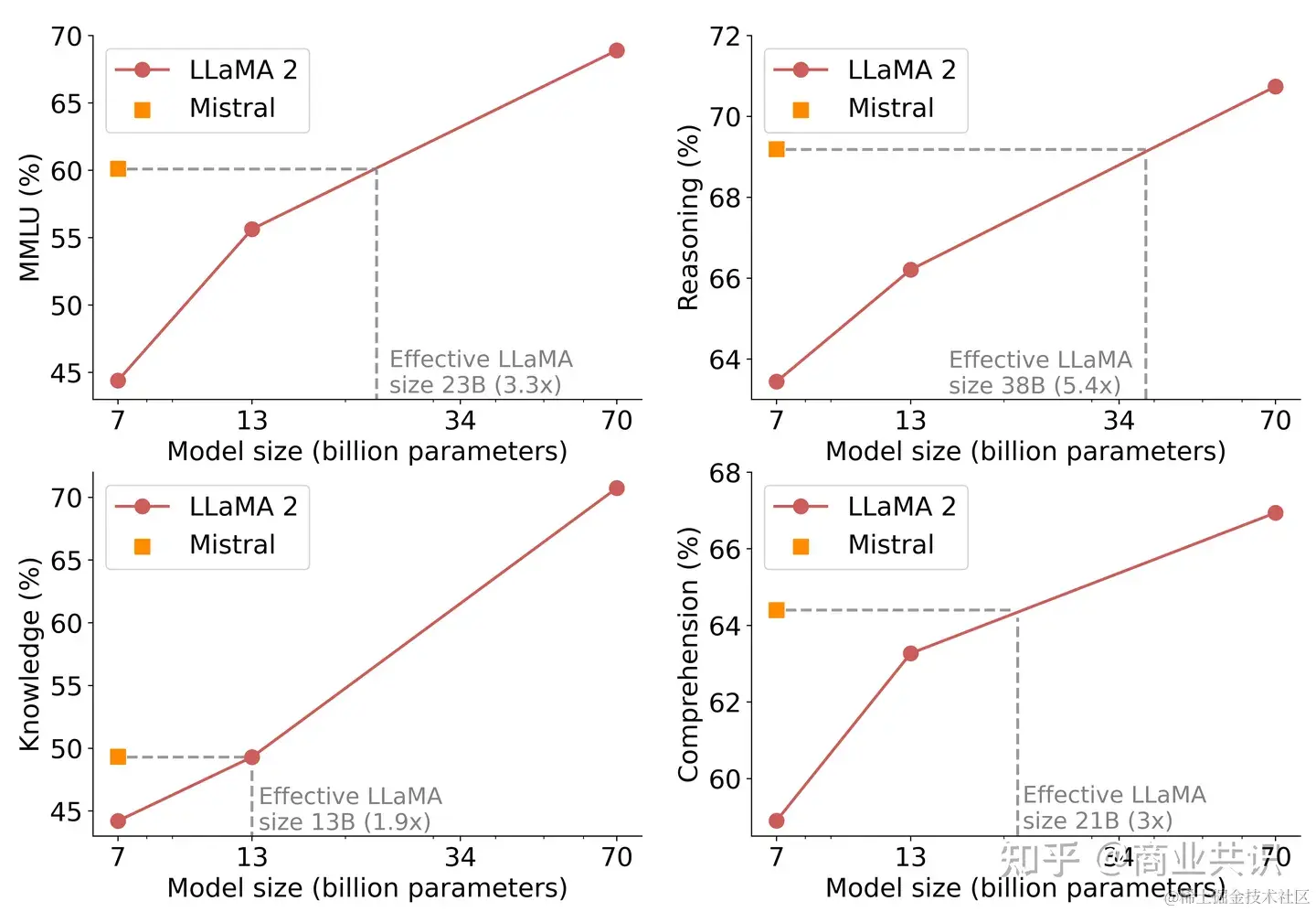 比较模型在成本/性能平面中的表现的一个有趣指标是计算“等效模型大小”。在推理,理解和STEM推理(MMLU)方面,Mistral 7B的性能相当于其大小超过2倍的Llama 3。这在内存中节省和增加的吞吐量一样多。