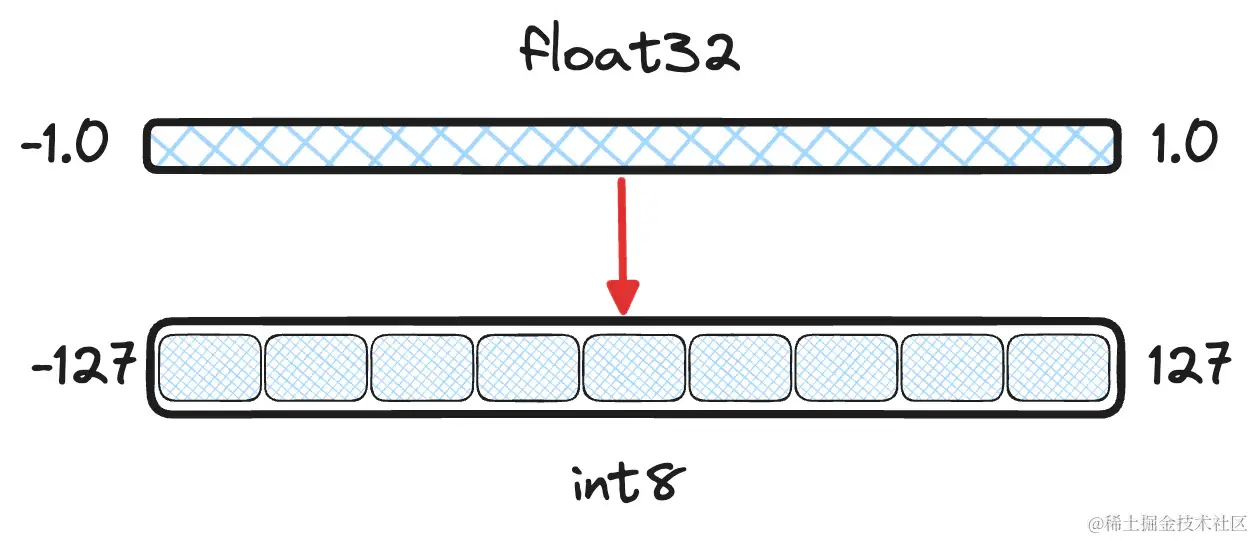 图 1:量化目标的图示,将从 -1.0 到 1.0 的连续值分桶为离散的 int8 值。