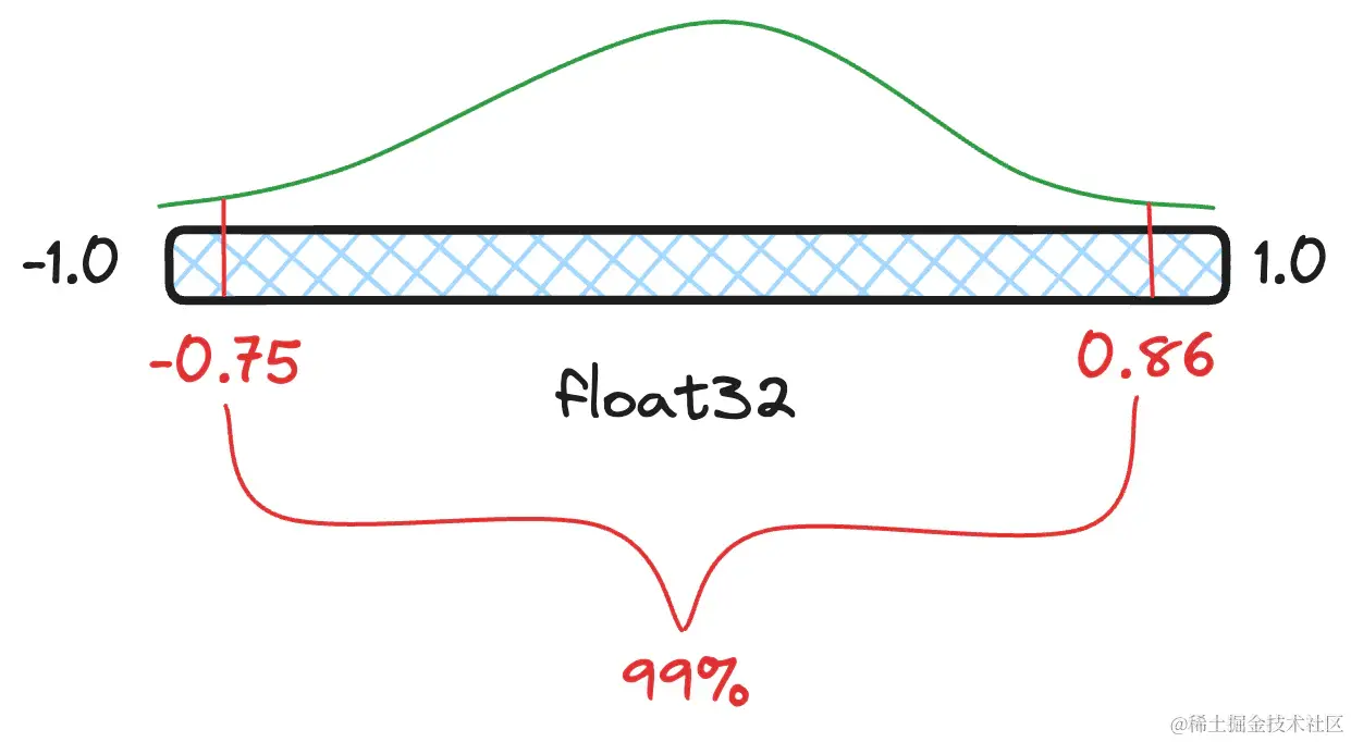 分位数 (quantile) 是包含一定百分比值的分布切片。 所以,举例来说,我们的浮点值可能有 99% 都在 [−0.75, 0.86] 之间,而不是真正的最小值和最大值 [−1.0,1.0] 之间。 任何小于 -0.75 和大于 0.86 的值都被视为异常值。 如果你在尝试量化结果时包含异常值,则最常见值的可用存储桶将会减少。 更少的存储桶意味着更低的准确性,从而导致更大的信息损失。