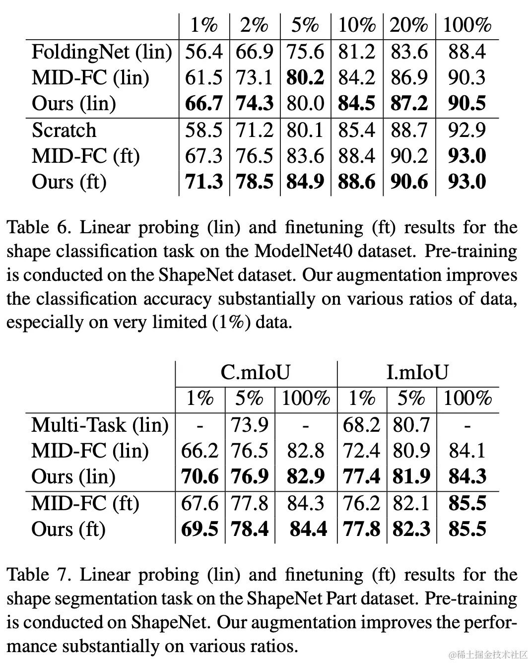 本文还在 ModelNet40 数据集的分类任务和 ShapeNet Part 数据集的分割任务上验证了 randomized quantization 相对于已有自监督工作的优越性。尤其在下游训练集数据量较少的情况下,本文的方法显著超过已有点云自监督算法。