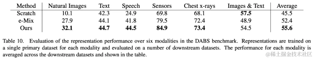 DABS 是一个模态通用自监督学习的基准,涵盖了多种模态数据,包括自然图像、文本、语音、传感器数据、医学图像、图文等。在 DABS 涵盖的多种不同模态数据上,我们的方法也优于已有的任意模态自监督学习方式。