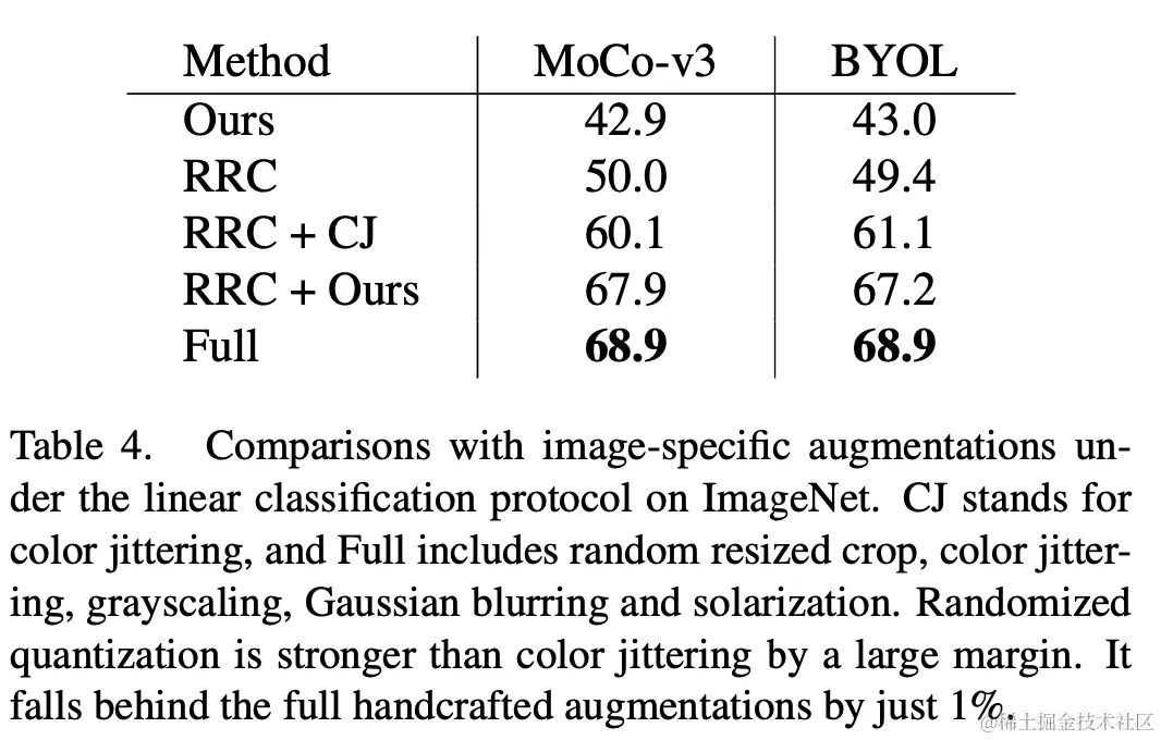 本文在 ImageNet-1K 数据集上评估了 randomized quantization 应用于 MoCo-v3 和 BYOL 的效果,评测指标为 linear evaluation。当作为唯一的数据增强方式单独使用的时候,即将本文的 augmentation 应用于原始图像的 center crop,以及和常见的 random resized crop(RRC)配合使用的时候,该方法都取得了比已有通用自监督学习方法更好的效果。