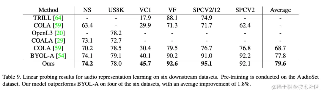 在语音数据集上本文的方法也取得了比已有自监督学习方法更优的性能。本文在六个下游数据集上验证了该方法的优越性,其中在最难的数据集 VoxCeleb1 上(包含最多且远超其他数据集的类别个数),本文方法取得了显著的性能提升(5.6 个点)。